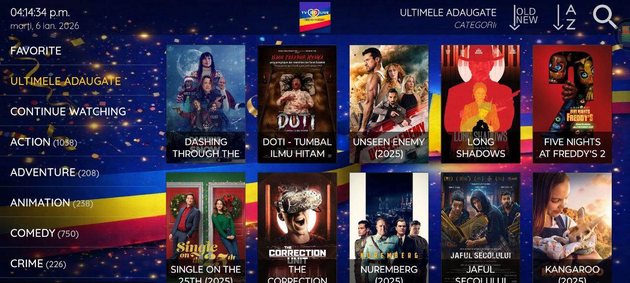 După selectarea din Meniul Principal a secţiuni Filme, aplicaţia va deschide automat lista completă de Filme Online. În partea stângă veţi găsi lista cu categoriile de filme.