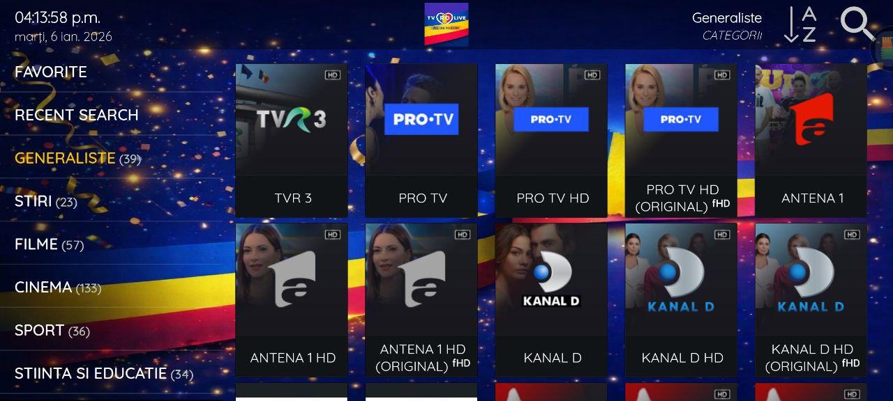 După selectarea din Meniul Principal a secţiuni Canale TV, aplicaţia va deschide automat lista completă de Programe TV. În partea stângă veţi găsi lista cu categoriile de programe.